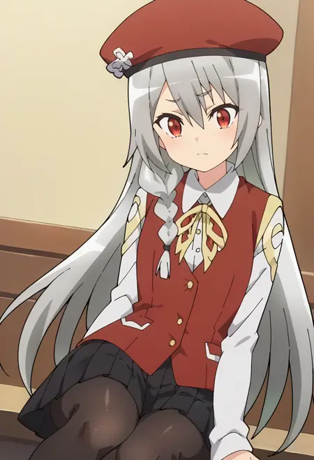 服装2:白色衬衫、红色背心、丝袜、贝雷帽、百褶裙、衬衫、丝带、长袖、闭嘴、红色头饰