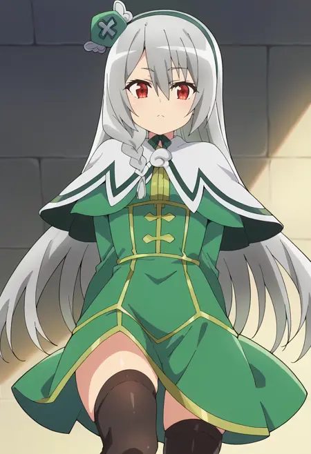 服装1:绿色连衣裙、过膝袜、小披肩、绿色发带、长袖、发饰、小帽子