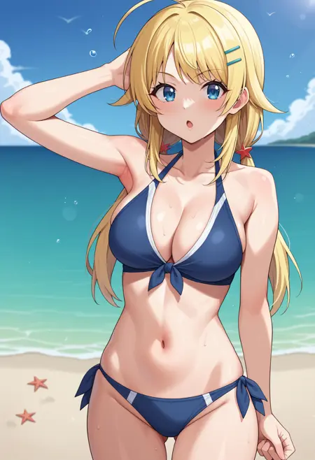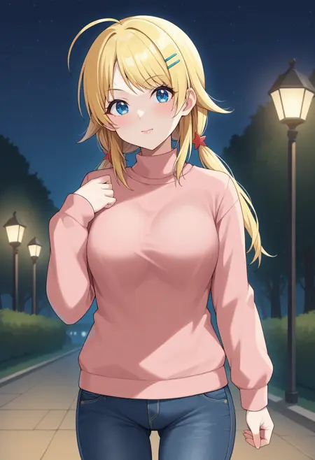 hachimiya meguru, long hair, blonde hair, low twintails, ahoge, hairpin, blue eyes