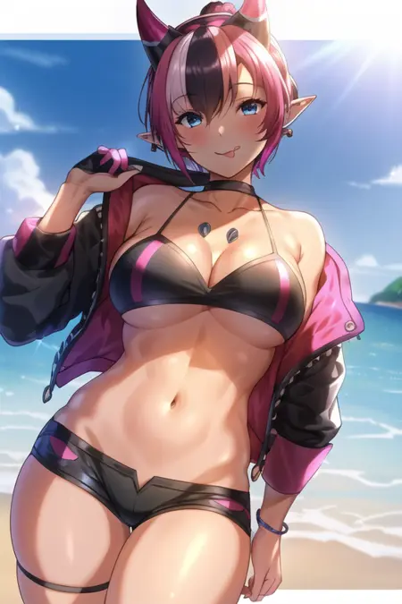 Clothing Tags: jacket, black headwear, gloves, bodysuit