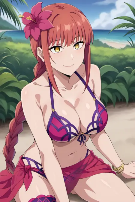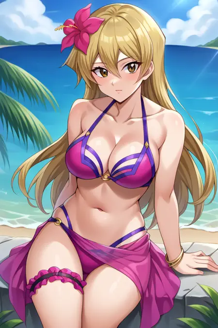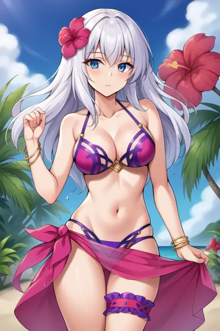 プロンプト: 裸の肩、ビキニ、ブレスレット、ウェディングガーター、胸元、鎖骨、花、髪の花、髪飾り、ハイビスカス、ジュエリー、へそ、パープルビキニ、サロング、水着、太もも,
