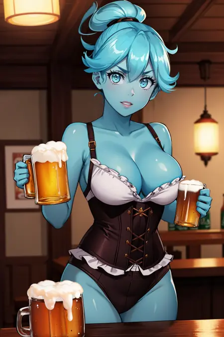 波莉·盖斯特(Monster Prom)角色 Lora。我建议使用 0.8~1.0 强度。触发词:pollygeist服装标签:项链,手链,戴在头上的眼镜,蓝色皮肤,短裤,背心
