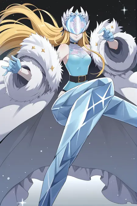 女孩,单独,长发,金色头发,大乳房,手套,腰带,紧身衣,毛皮镶边,面罩,菱形图案,蓝色紧身衣,眼罩,过膝袜,头盔,冰