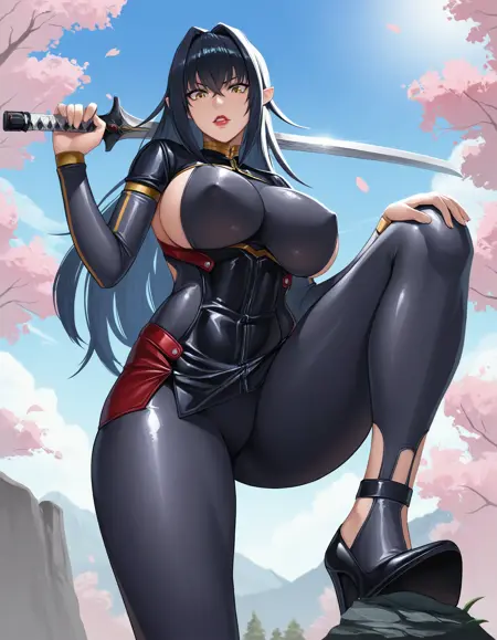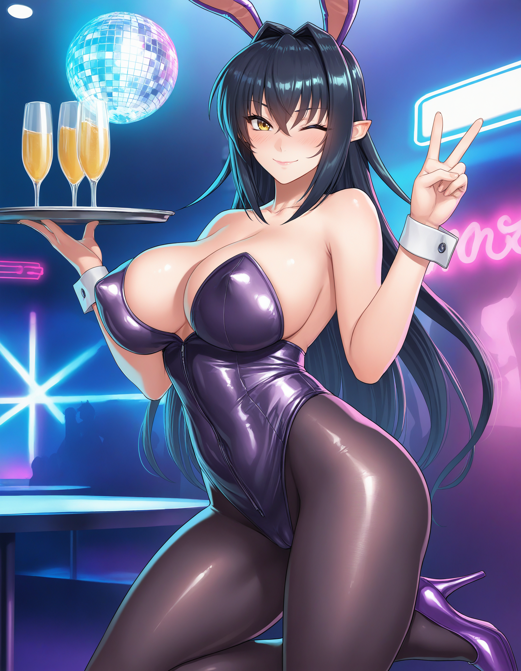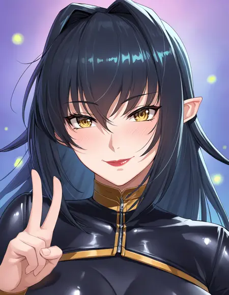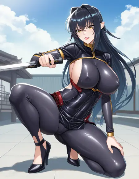 Annerose, 1girl, 成人女性, 黒髪, 長い髪, 黄色い目, 大きな胸, ボディスーツ, ハイヒール, つやのある衣装, 皮膚に貼りつく, 髪の取り入れ, 乳首見え, サイドブーブ, クリーバージュ