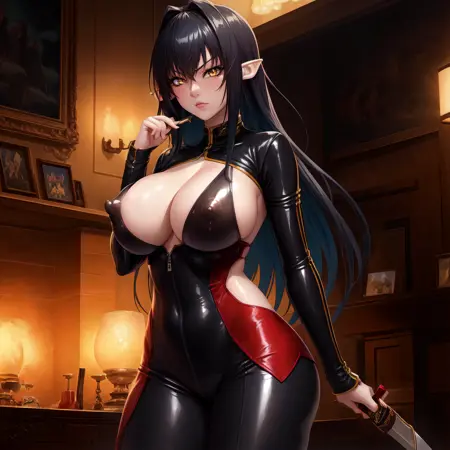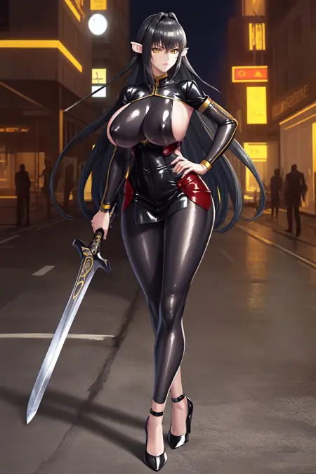 Annerose, 1girl, 成人女性, 黒髪, 長い髪, 黄色い目, 大きな胸, ボディスーツ, ハイヒール, つやのある衣装, 皮膚に貼りつく, 髪の取り入れ, 乳首見え, サイドブーブ, クリーバージュ