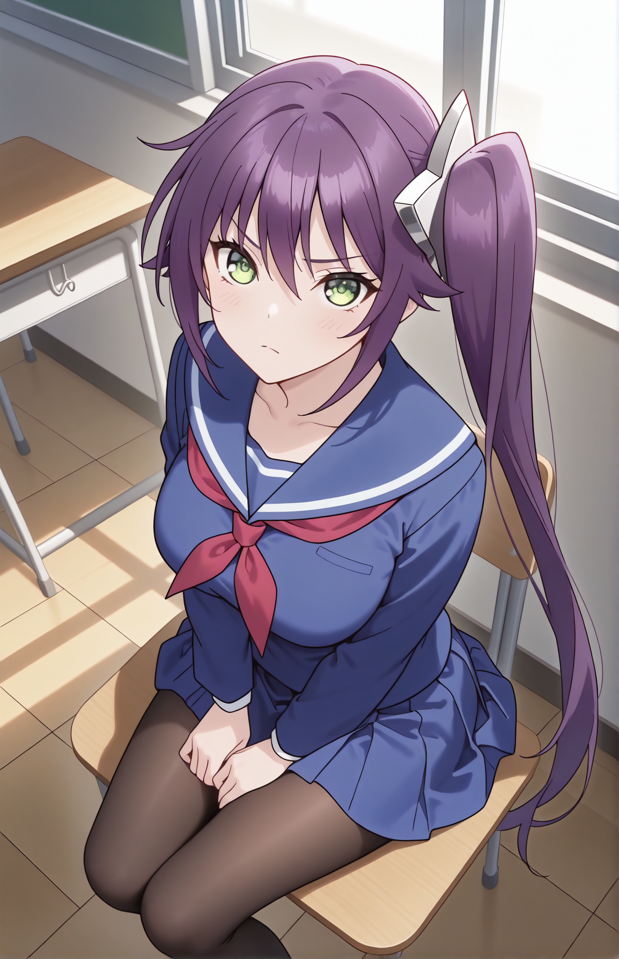 sagiri, 1girl, solo, green eyes, purple hair, side ponytail, long hair, hair ornament
