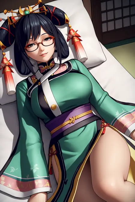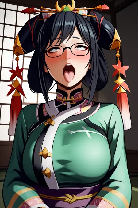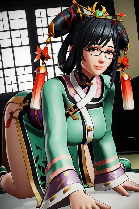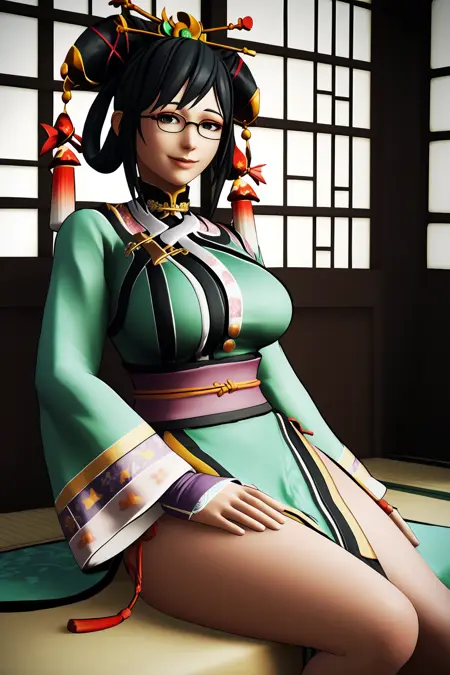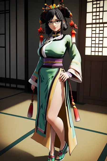 ➜ WuRuixiangSSXL, 黒メガネ, 黒目, 黒髪, 短髪, 横髪, 前髪, 髪飾り, 髪輪, 髪棒, 大きな胸, 中国風衣装, 緑色のドレス, 長い袖, 帯, 緑色の靴