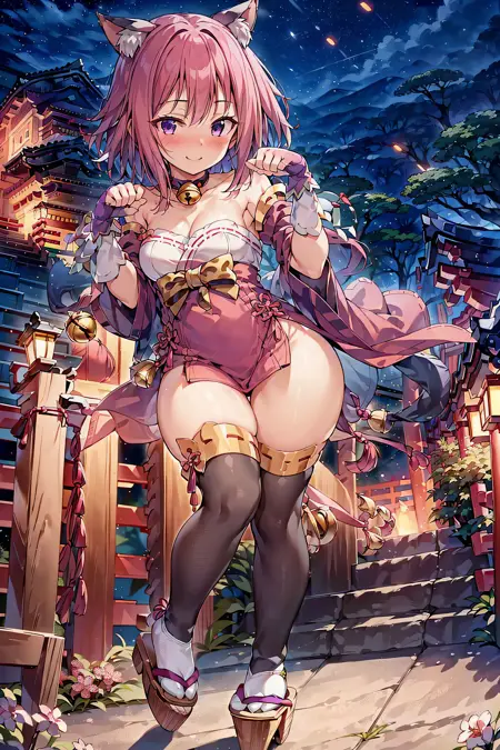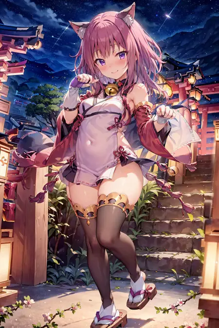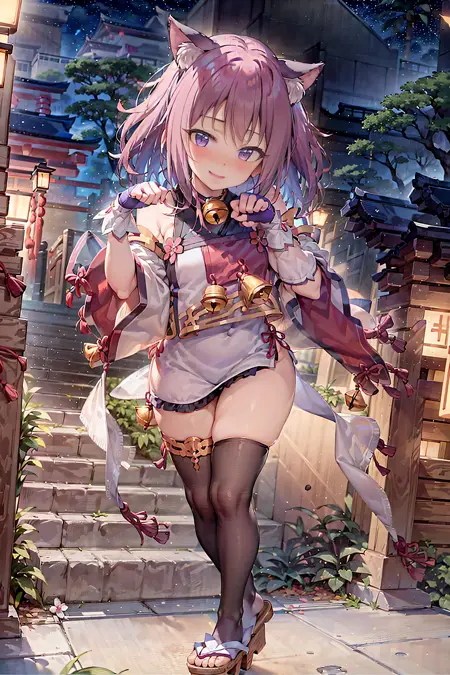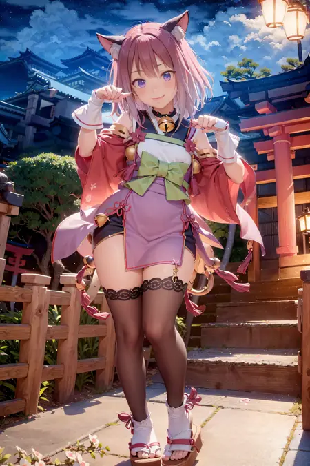 "보라색 눈, 동물 귀 털, 짧은 머리, ((목 빅토리아)), 히프하이, (((일본식 옷)), 거타, 검정색 다리 복장, (분리형 소매), (손가락 없는 장갑), 타마키 \(프린세스 커넥트!\)"