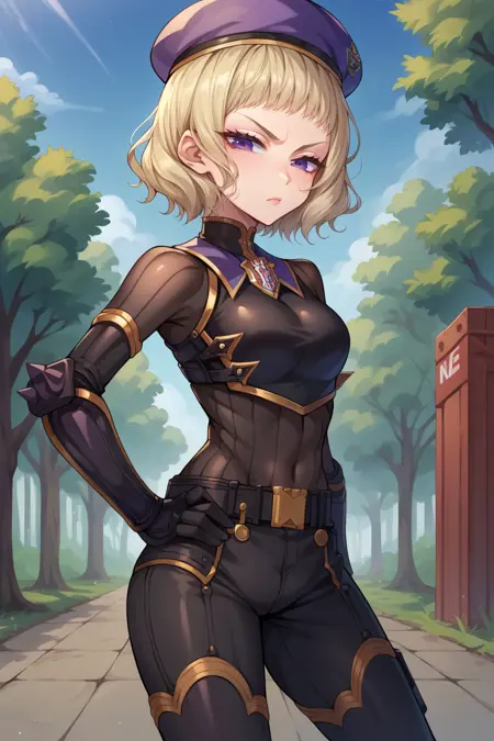 添加 "贝雷帽、黑色紧身衣、露指手套、腰带、黑色长裤、靴子" 以呈现她的典型造型。