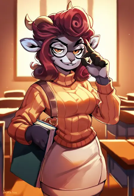 Absa: absa, furry, female, goat, purple fur, pink hair, yellow eyes, bolt wings