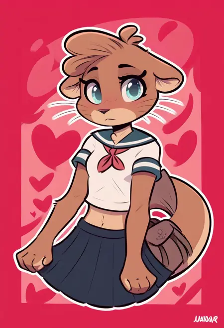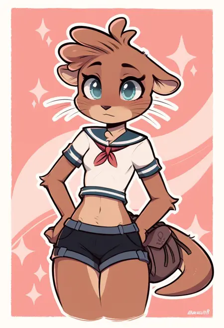 ottie, otter, furry female, aqua eyes, whiskers, animal ears, tail, sailor uniform, tail bag, sailor collar, neckerchief, shorts