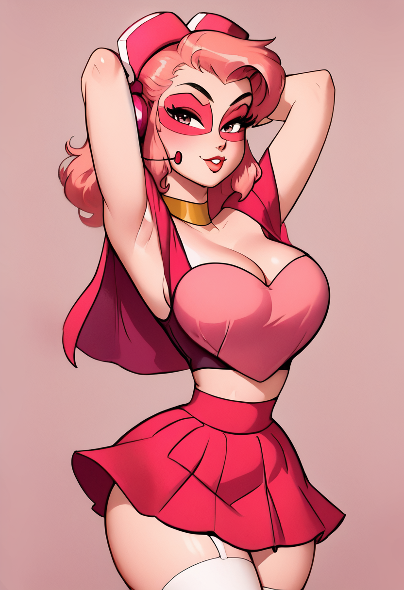 슈퍼히어로 복장: 카프렛, 어깨 노출, 견갑골, 짧은 소매, 흉부 노출, 골든 초커, 스트랩리스, 핑크 하트 모양 크롭탑, 핑크 헤드폰, 헤드셋, 핑크 선글라스, 흰색 무릎 위 부츠, 핑크 미니스커트, 핑크 둥근 팔찌, 흰색 허벅지 긴 양말,