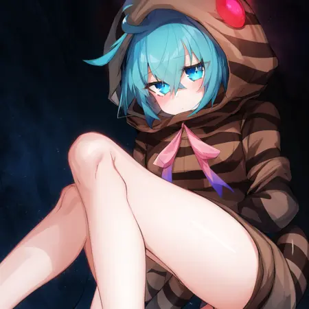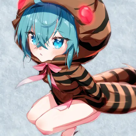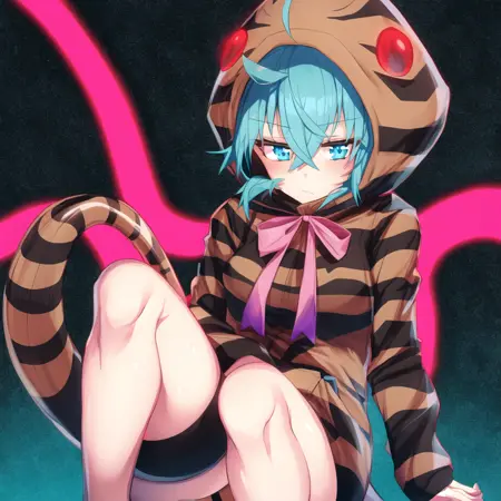 生成标签:tsunsnek, 1girl, solo, hood, hoodie, snake tail, aqua hair, long sleeves, striped hoodie, striped tail, short hair, pink neck ribbon, bangs, hair between eyes, hood up, geta, blue hair, aqua eyes, bare legs, blue eyes, crossed bangs, ahoge