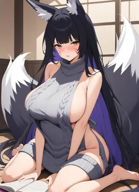 原版(origen):musashi_\(azur_lane\), 長髪, 黒髪, 狐の耳, 顔の模様, 狐の尾, 狐の娘, 髪飾り, 玉飾り, 毛皮縁取りの着物, スカート,