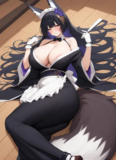 堇色月影(violet_moonglow):musashi_\(azur_lane\), 長髪, 黒髪, 黄色の目, 狐の耳, 顔の模様, 狐の尾, 大きな胸, 髪の花, 長いドレス, 黒い着物, 黒い蝶ネクタイ, メイドの頭飾り, 白い手袋, アプロン