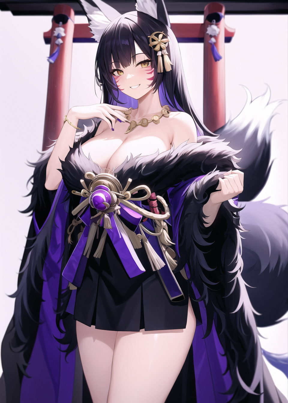 원본(origen): 무사시(Azur Lane), 긴 머리, 검은 머리, 여우 귀, 얼굴 무늬, 여우 꼬리, 여우 소녀, 머리 장식, 마가타 목걸이, 털 장식이 있는 기모노, 치마,