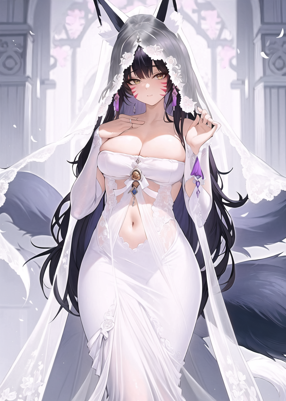 자연의 순수한 자작나무 마음(purest wisteria): 무사시(Azur Lane), 긴 머리, 검은 머리, 여우 귀, 얼굴 무늬, 여우 꼬리, 여우 소녀, 큰 가슴, 웨딩 드레스, 신부 베일, 투명한