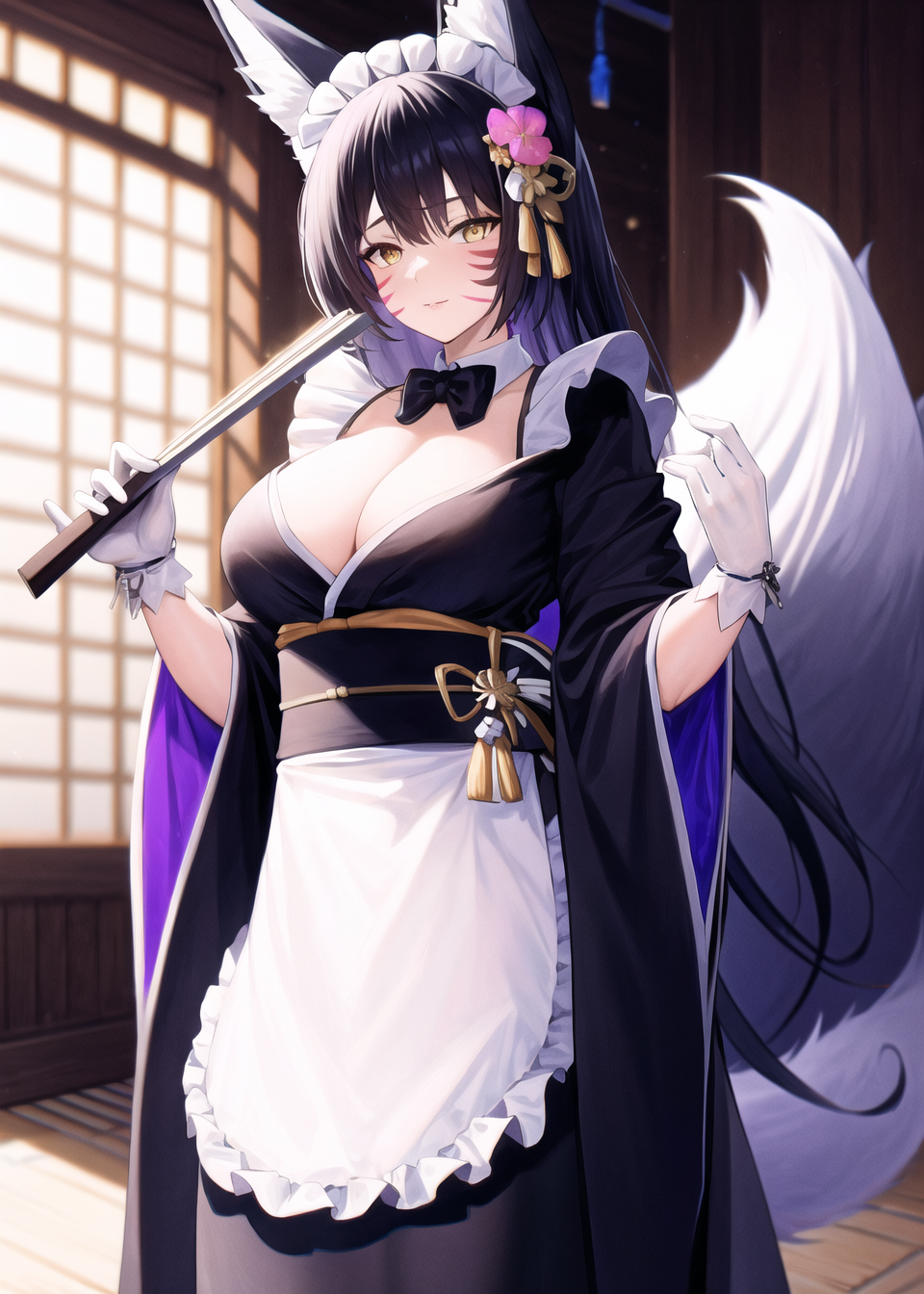 보라 달빛(violet moonglow): 무사시(Azur Lane), 긴 머리, 검은 머리, 노란 눈, 여우 귀, 얼굴 무늬, 여우 꼬리, 큰 가슴, 머리 꽃, 긴 드레스, 검은 기모노, 검은 단색 넥타이, 메이드 헤어 액세서리, 흰 장갑, 앞치마,