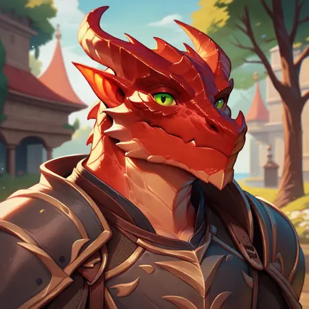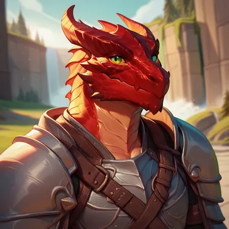例のプロンプト: Dragonborn, furry dragon, 1girl, green eyes, red scales
