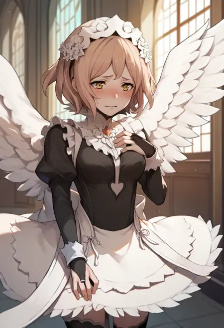 durgaGR, 단발, 머리꽃, 흰 날개, 소 무늬 드레스, 가슴 노출, 짧은 소매, 흰 바지, 줄무늬 양말, 검은 부츠