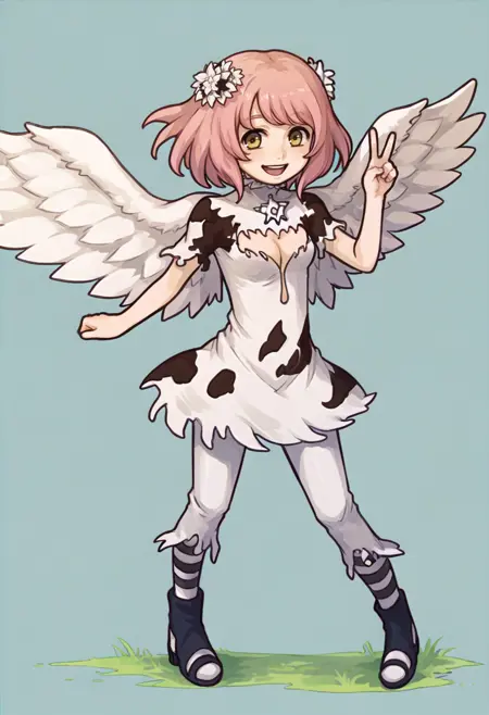 durgaGR, short hair, hair flower, white wings, cow print dress, cleavage cutout, short sleeves, white pants, striped socks, black boots