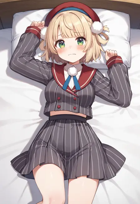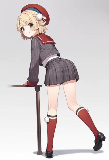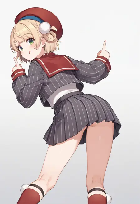 shigureui-default,shigure ui \(vtuber\),绿色眼睛, 金色头发, 短发, 发圈, 毛球发饰, 贝雷帽, 条纹夹克, 红色水手领, 毛球(服饰), 条纹裙子, 红色袜子, 黑色乐福鞋