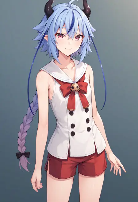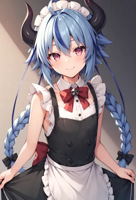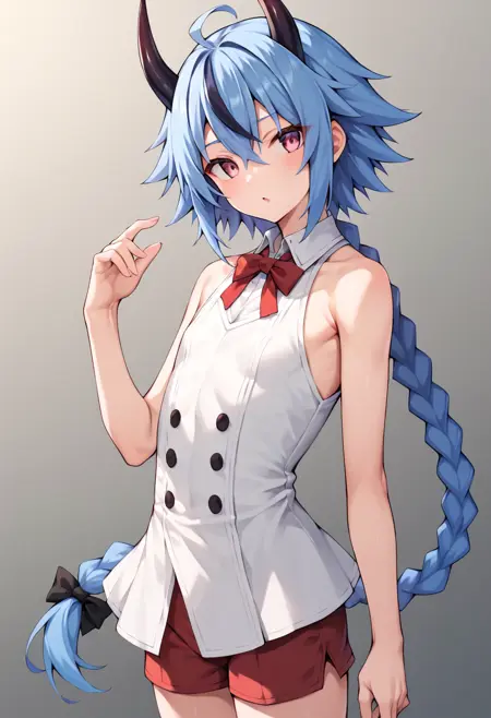 meika mikoto, horns, blue hair, multicolored hair, braid, pink eyes,