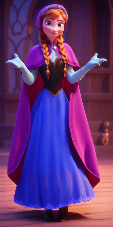 アンナのトラベル衣装(ハーフアップ編み、紫のマント)
