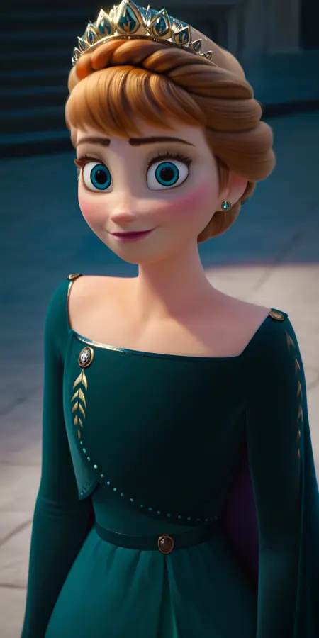 アンナの戴冠ドレス(ティアラ、編み上げヘアスタイル、アップドゥ、イヤリング、ダークグリーンのマント)