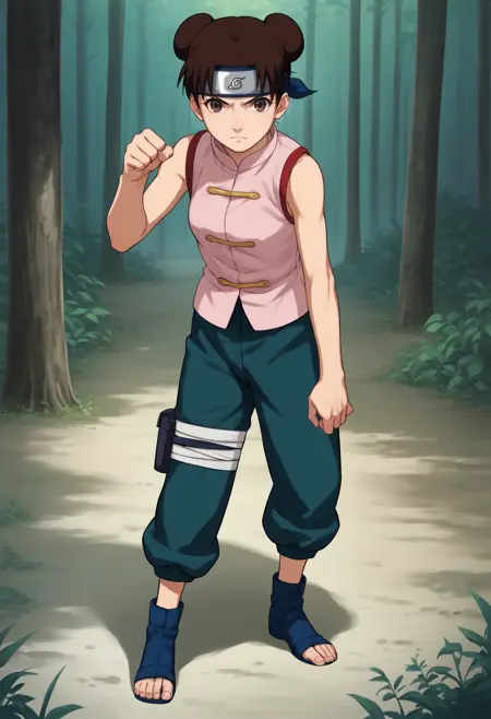 基本プロンプト:1girl, ytenten, brown eyes, brown hair, short hair, double bun, forehead protector, konohagakure symbol