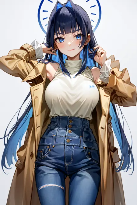 例: ouro kronii, blue_hair, hair intakes, colored inner hair, long_hair, huge_breasts, two-tone_hair, blunt bangs, sidelocks, hime cut, halo, white shirt, sleeveless turtleneck, brown coat, off shoulder, jeans, high-waist pants
