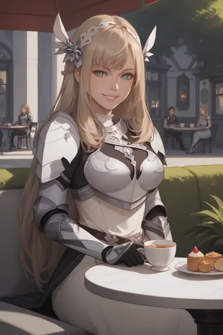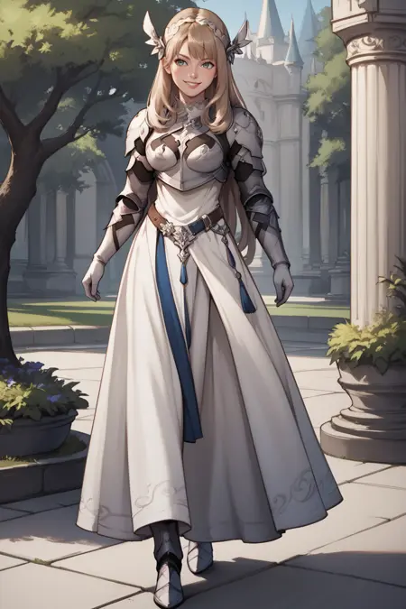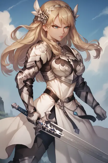Trigger : mriavalkelysm, long hair, bangs, hair ornament, pauldrons, breastplate, braid, gauntlets, gloves, dress, belt, thigh boots