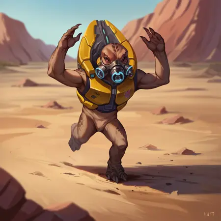 通用提示:score_9, score_8_up, score_7_up, score_6_up, score_5_up, score_4_up, halogrunt, 1boy, lizard, alien, yellow armor, backpack, full body, gas mask