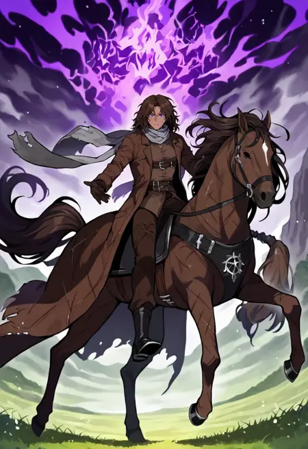 希斯克利夫厄尔林王,长发,棕色外套,敞开外套,灰色围巾,棕色长裤,黑鞋,棕色衬衫,棕色手套,剑