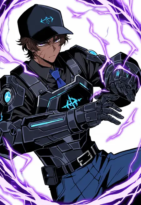 HeathcliffWcorp, black baseball cap, black bulletproof vest, black shirt, blue necktie, black exosuit gauntlets, blue pants, black belt, black armored knee boots, huge mechanical arms