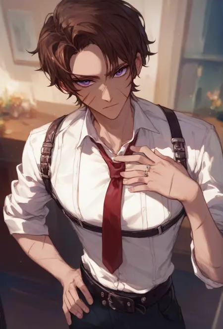 HeathcliffOufi, black footwear, black headwear, black capelet, black pants, white shirt, black vest, purple necktie