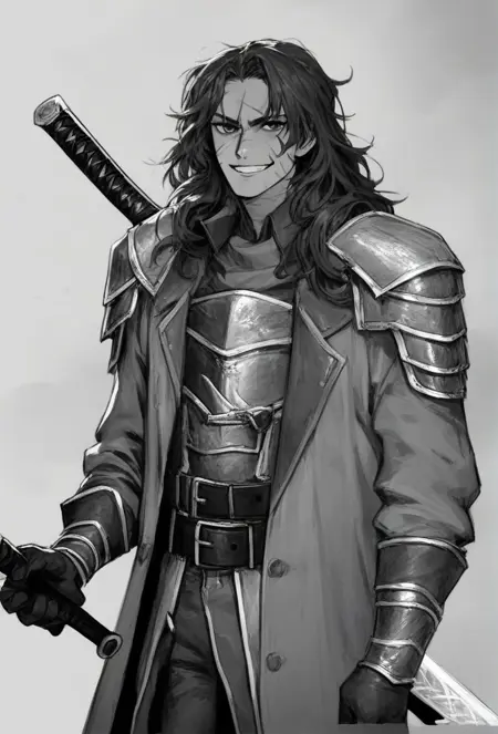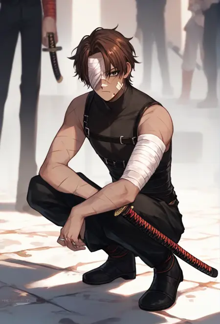 HeathcliffShi, black pants, black footwear, black T-shirt, sleeveless, katana, scars