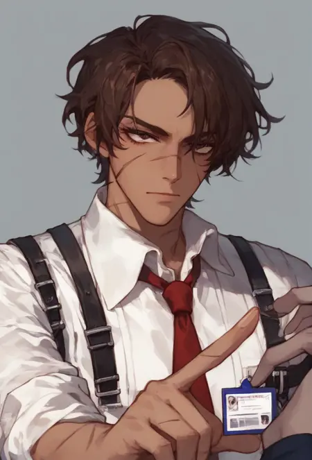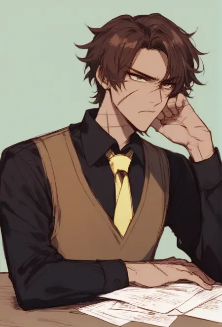 HeathcliffSeven, yellow necktie, brown vest, black shirt, green jacket, black pants, black footwear, holding paper, sword