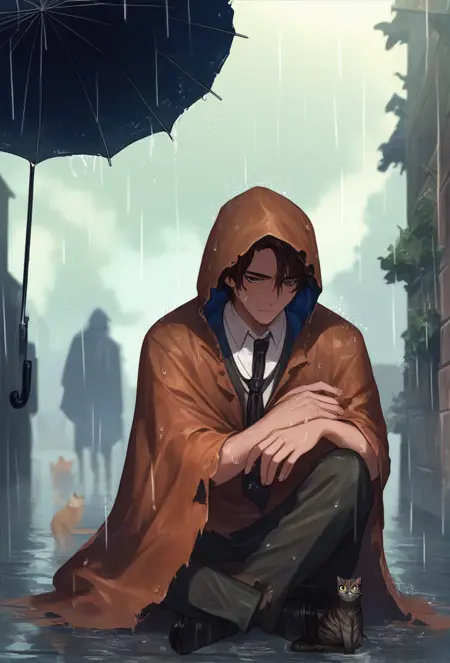 HeathcliffSunshower, umbrella, raincoat, brown footwear, black pants, black shirt, white necktie