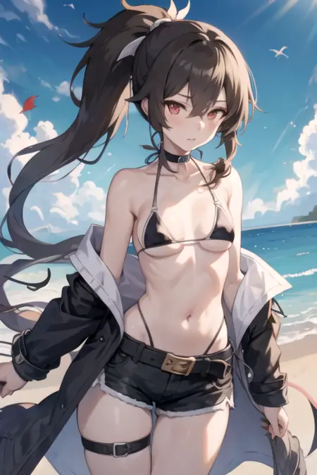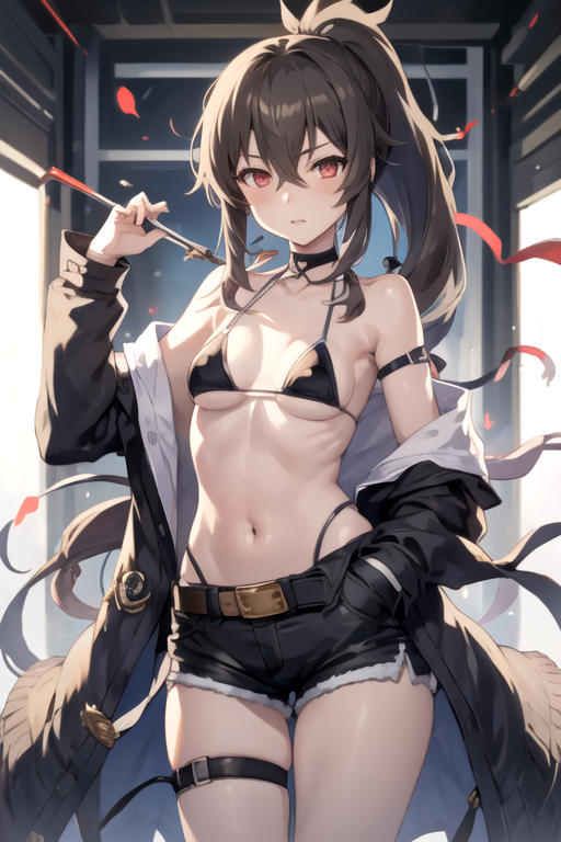 | 训练词汇 | M4chineCollector, 1girl, solo, long hair, brown hair, black hair, red eyes, navel, hair between eyes, bare shoulders, medium breasts, collarbone, ponytail, black bikini, shorts, choker, belt, open clothes, grey coat, thigh strap, bikini top only已复制! |