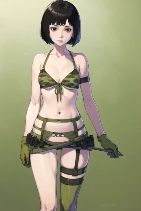 HollySummers, 1girl, solo, short hair, black hair, single thighhigh, gloves, bob cut, front-tie top, garter belt, green bikini, medium breasts, green gloves, navel, cleavage, black eyes, camouflage