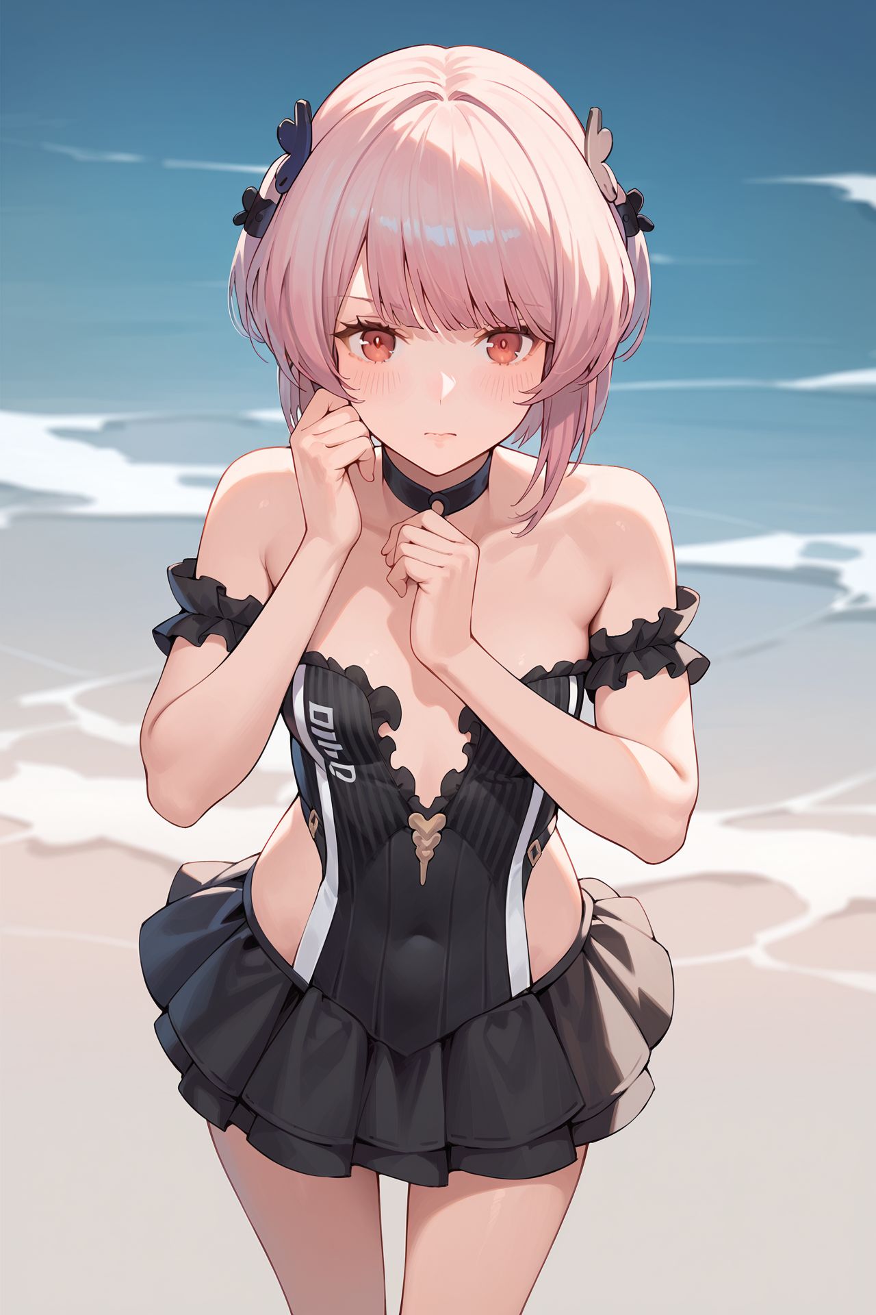 可选:裸露肩膀、荷叶边、连衣裙、项圈、过膝袜、鞋子、发饰、大腿绑带、紧身衣、臂箍、手镯