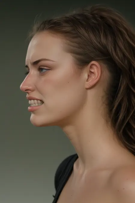 여성이 분노로 이를 악물고 있는 표정의 개념. 기본 시점/각도는 정면과 측면 사이의 위치이다. 이를 정확히 정면 또는 측면으로 고정하려면 "정면 시점" 또는 "측면 프로파일 시점"을 사용하라. "여성"이라는 표현만으로도 충분하지만, 특정 요소를 강조하려면 더 구체적으로 설명할 수 있다. 예: "분노로 이를 악물고 있는 여성" 등.