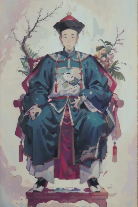 期待される出力: 正面視の肖像、全身または上半身、座り姿、非常に格式高い雰囲気、中国伝統服(ただし細部は正確でない)。