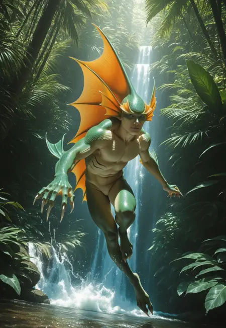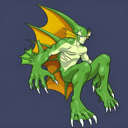 Illustrious tags: rikuo, solo, full body, 1boy, fish boy, green skin, colored skin, blue eyes, head fins, dorsal fin, fins, claws, gills, webbed hands, webbed feet