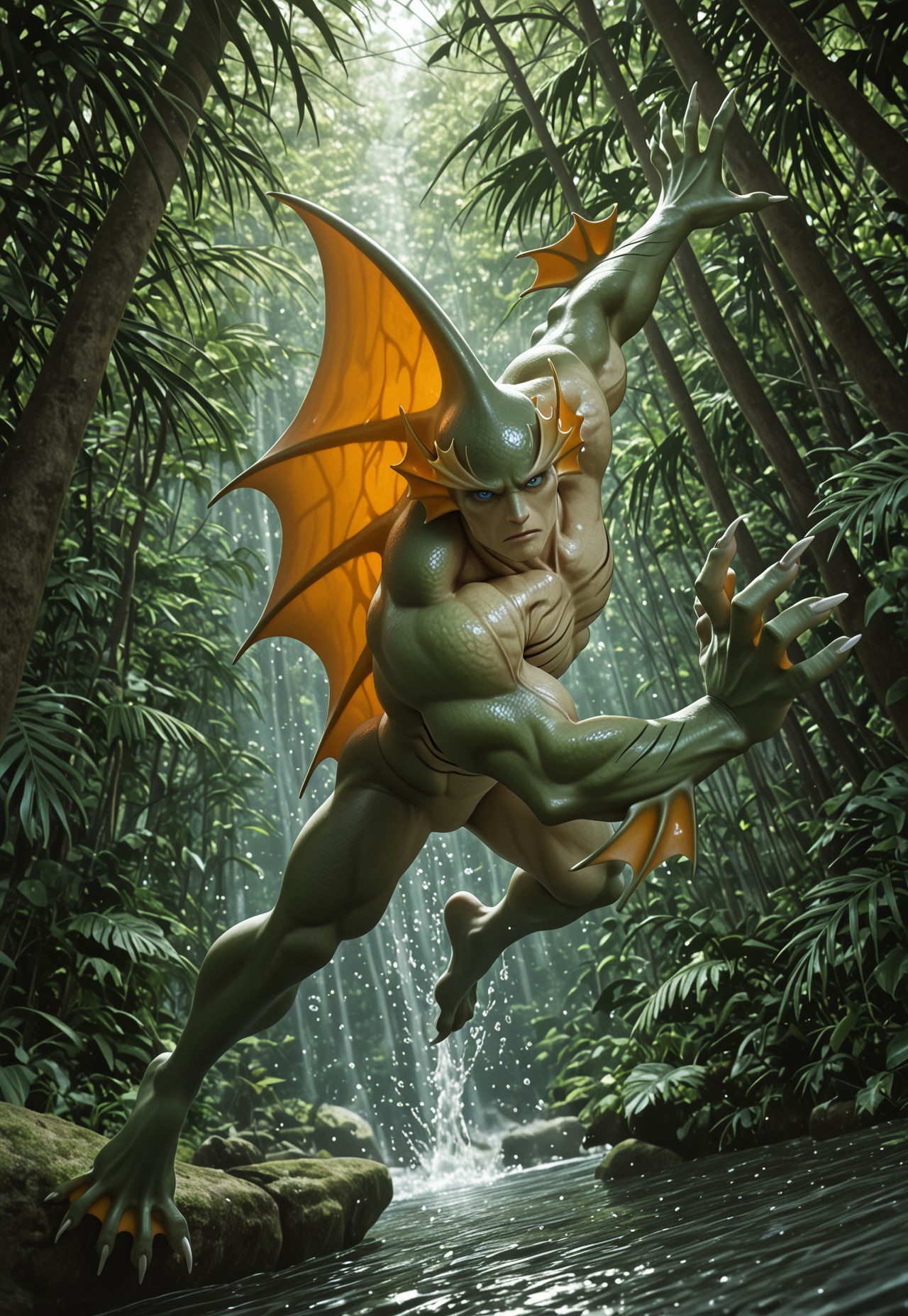 유명한 태그: rikuo, solo, full body, 1boy, fish boy, green skin, colored skin, blue eyes, head fins, dorsal fin, fins, claws, gills, webbed hands, webbed feet