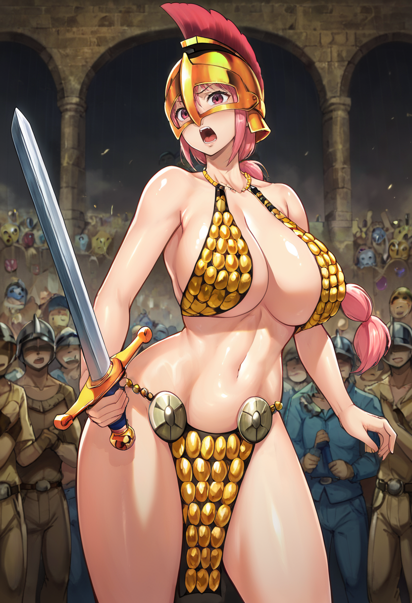 1girl, solo, rebecca, wearing bikini armor, golden armor, blue cape, helmet
