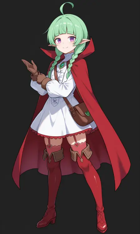 white long sleeve dress, red cape, green brooch, brown gloves, shoulder bag, garter straps, red thigh-high boots