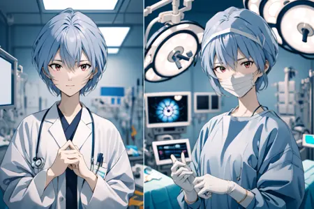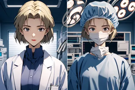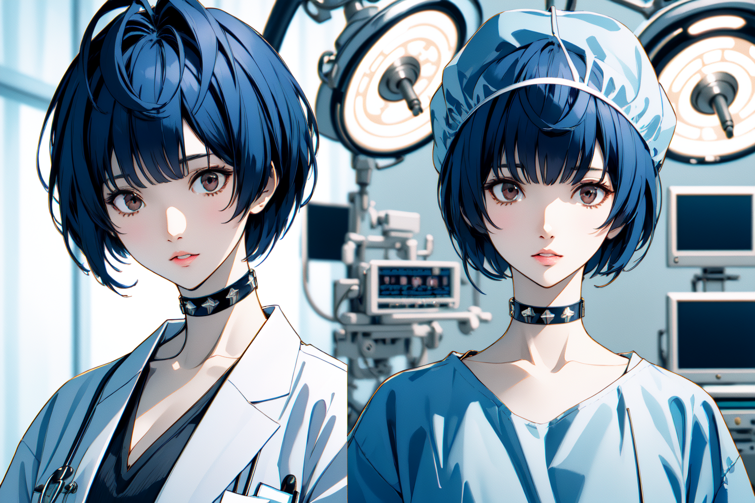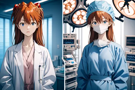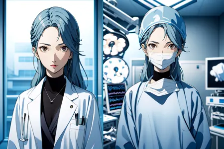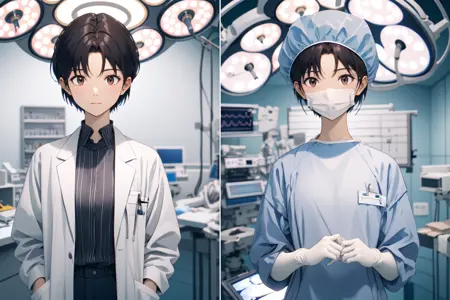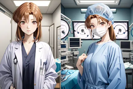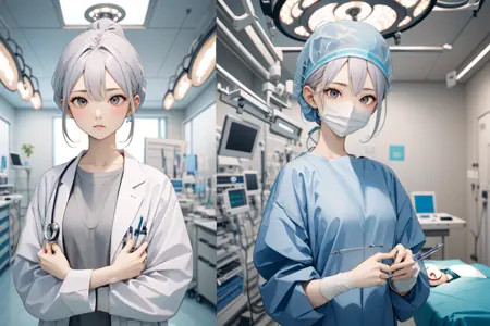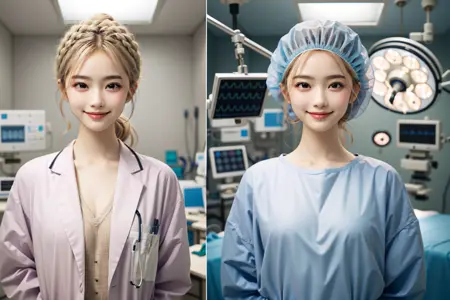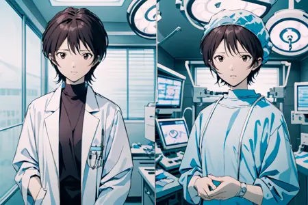 これは概念実験です。同じ人物の異なる衣装を横に並べて描くモデルを作りたかったのです。このモデルは、1枚の画像内で医師のラボコートと手術用衣装を描きます。