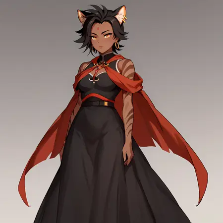Trigger: SiennaKhan_RWBY (Optional: dark-skinned female, animal ears,long black dress, red shawl, black pants)